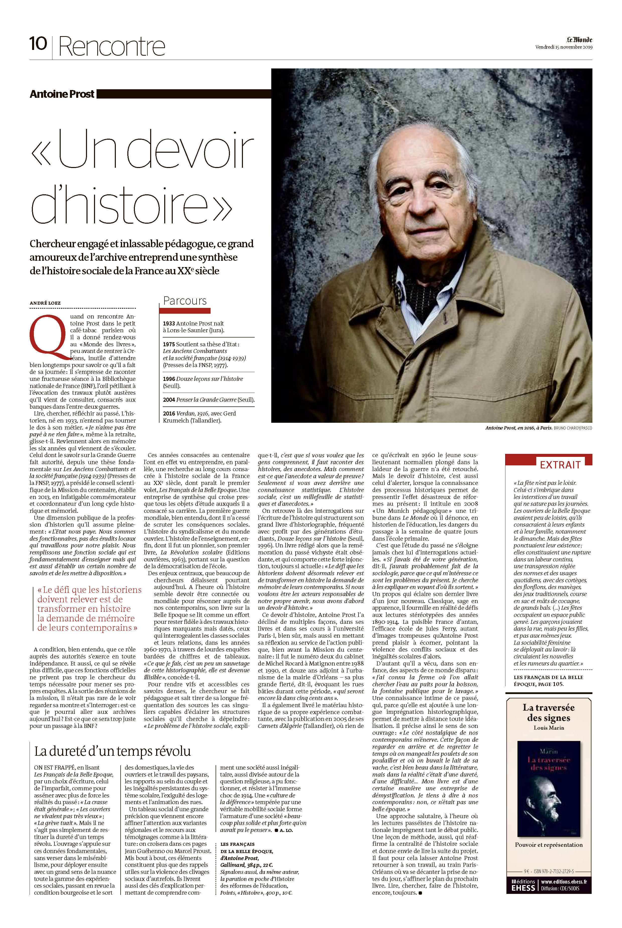 Je tiens à signaler l’excellente page consacrée par le journal Le Monde dans son édition du 15 novembre à mon ami Antoine Prost, qui est l’un des plus grands historiens travaillant sur la société française au XXe siècle. Cette page montre combien l’histoire est précieuse pour le présent. Faut-il rappeler qu’Antoine Prost s’est pleinement engagé pour la ville d’Orléans en exerçant la fonction d’adjoint à l’urbanisme de 1989 à 2001.
